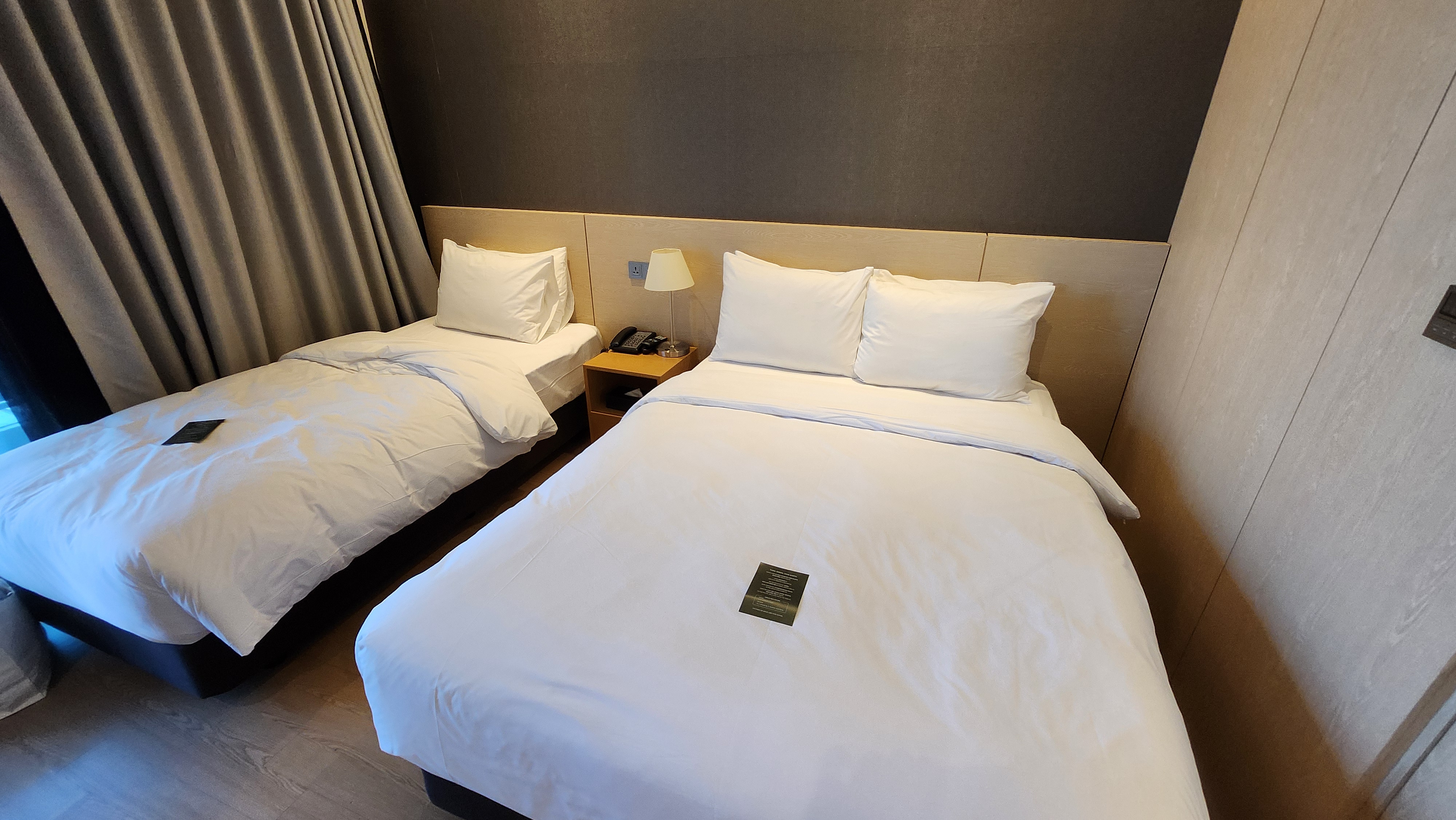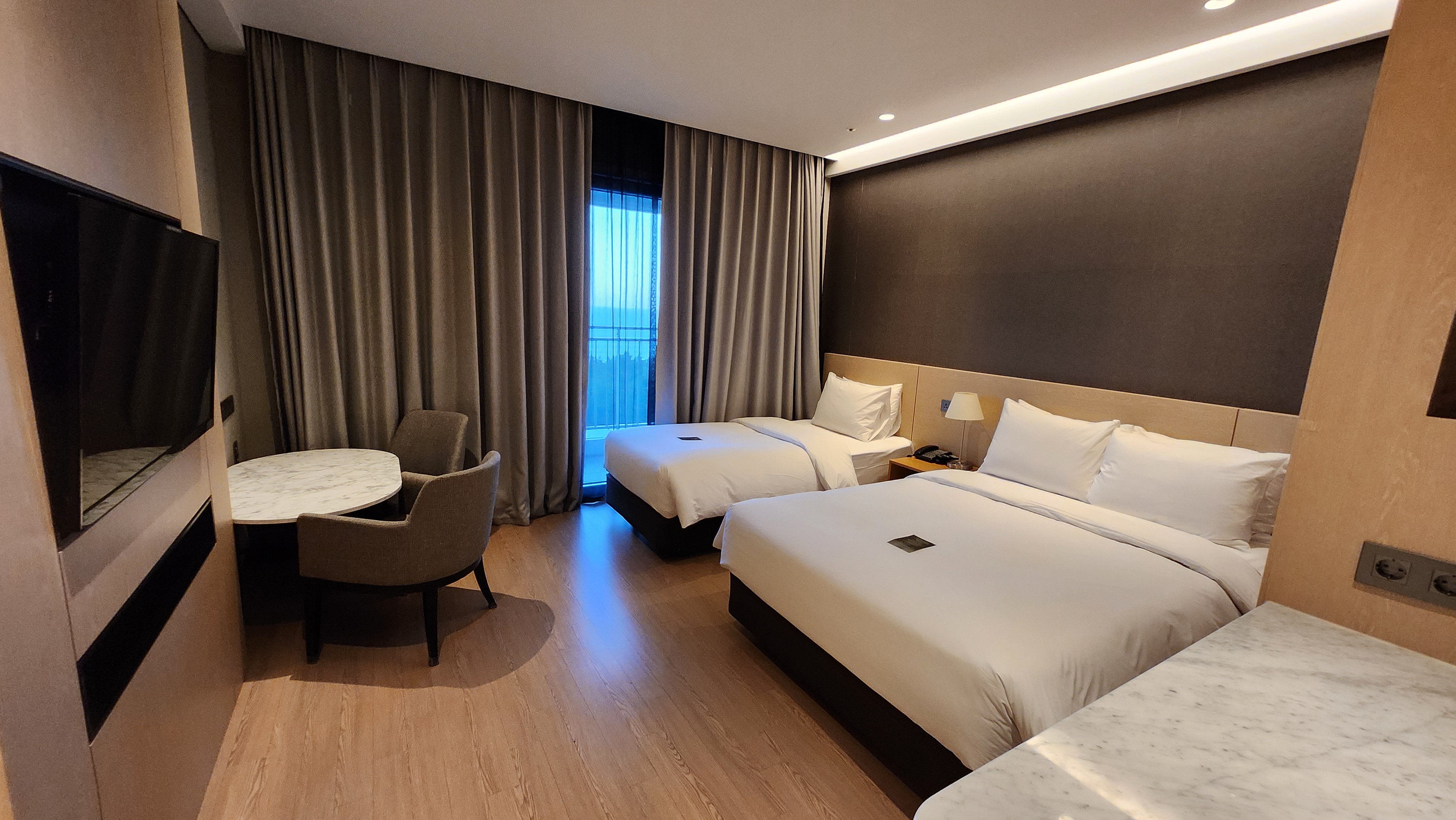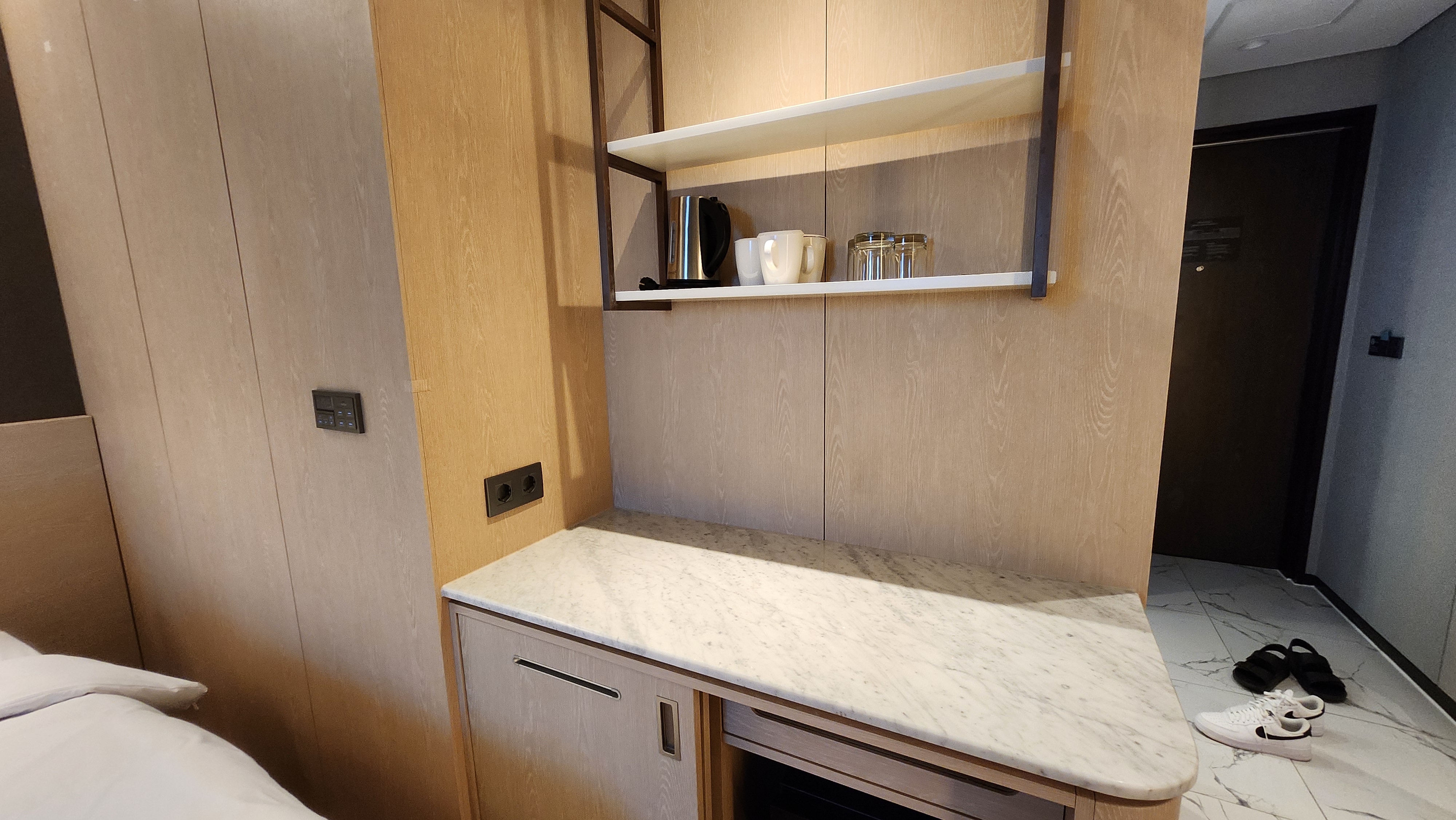제가 예약한 객실은 골져스 오션 트윈 룸으로 5급(5성급)에 맞는 깔끔했습니다. 객실 내부는 넓진 않았지만 전반적으로 고급진 느낌이었고, 더블침대와 싱글침대, TV, 미니테이블, 화장실, 옷장, 책상, 미니바 등 대부분 갖추고 있습니다.