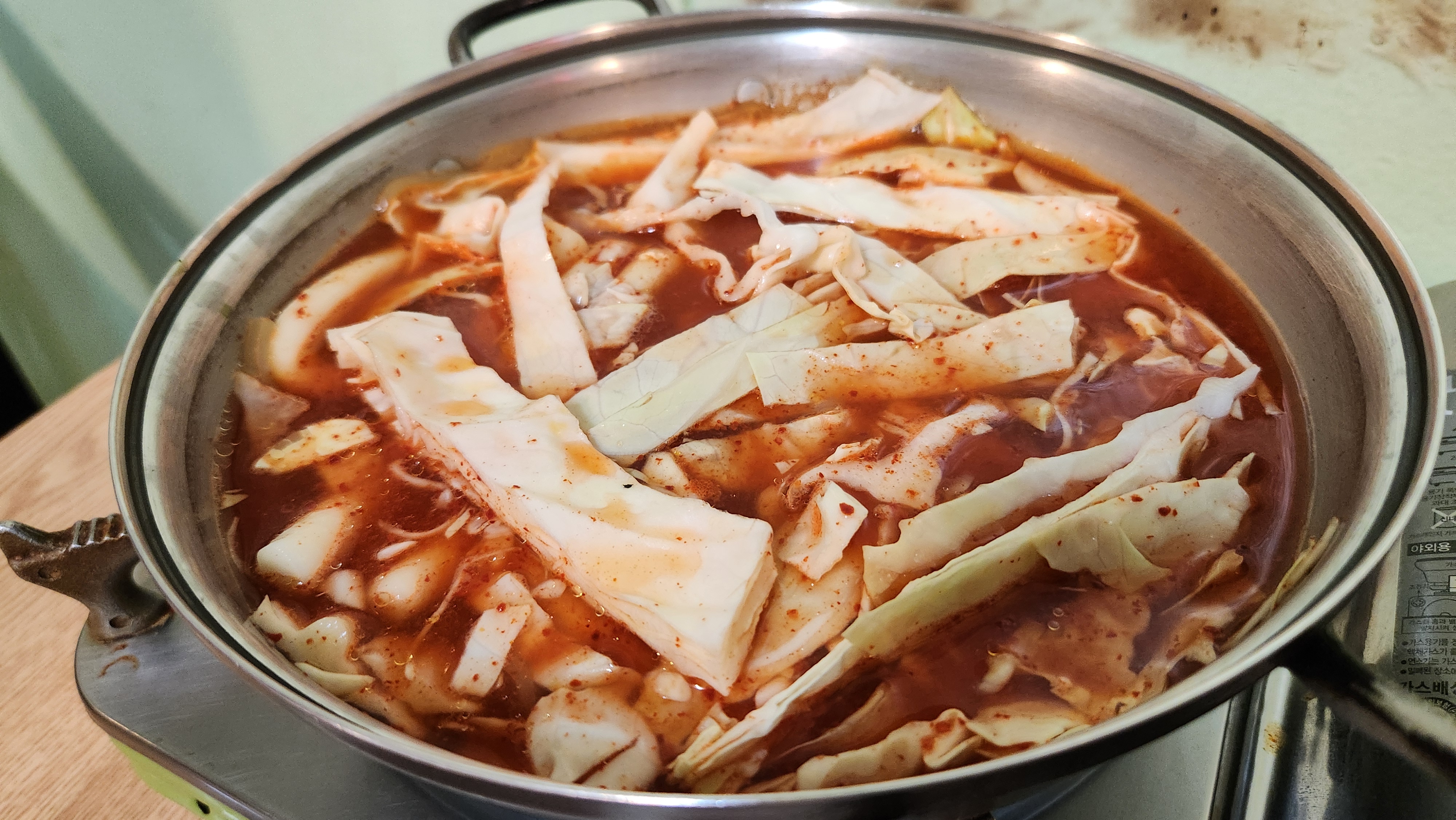 떡볶이는 즉석떡볶이로 양배추, 떡, 쫄면 정도가 들어가 있었습니다. 그 외 특출난 재료가 들어간 것 같진 않은데, 유명하다니 끓이면서도 얼마나 맛있을지 기대가 됐습니다.