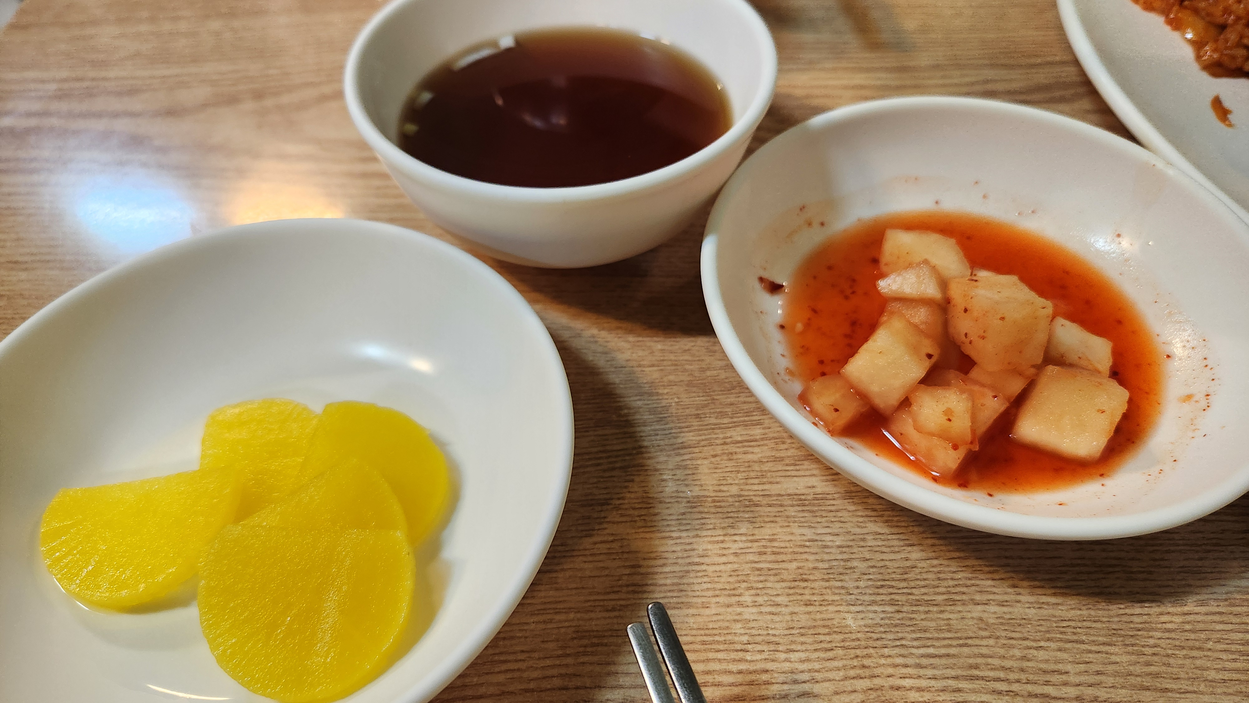 자리를 잡으면 처음 기본 반찬으로 단무지와 깍두기, 그리고 장국(?)을 내주십니다.