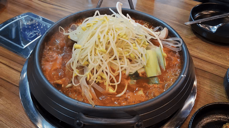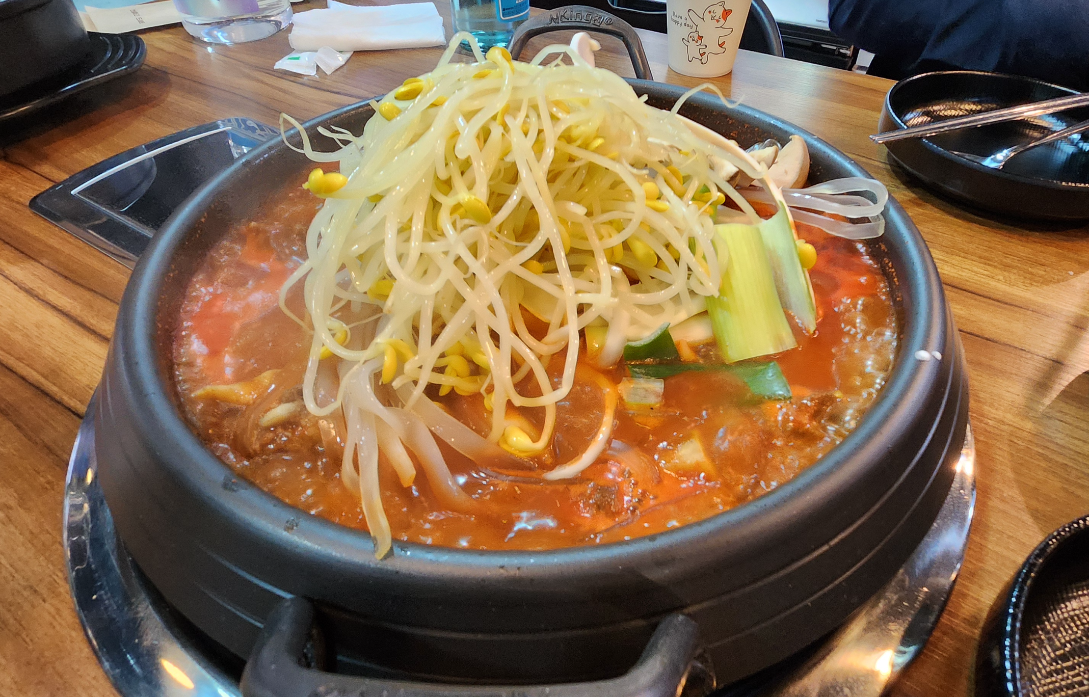 아래에는 소갈비와 당면, 떡 등 각종 사리들이 들어있고 위로는 콩나물이 산더미처럼 쌓여 나왔습니다.