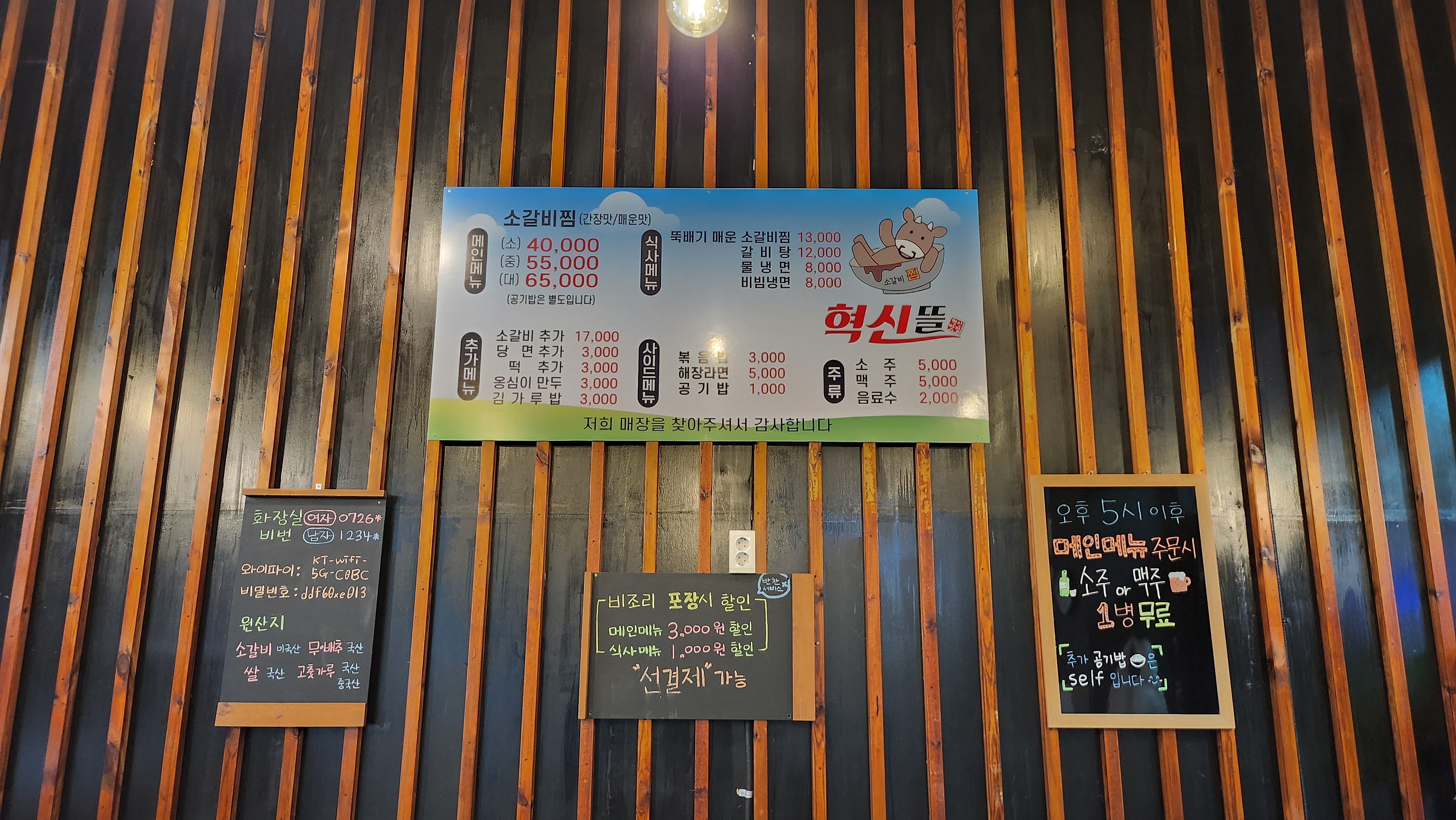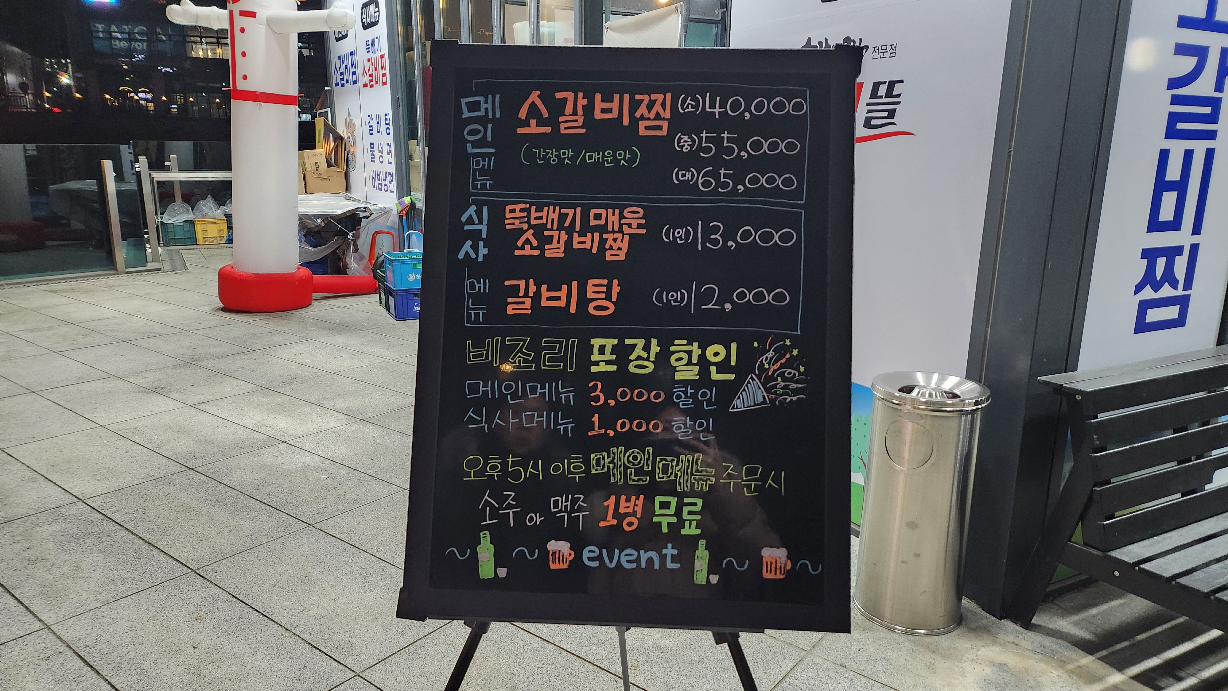 입장했을 때 저희 일행밖에 없어서 바로 자리를 잡고 매운 소갈비찜 小 (40,000원) 하나와 소주 1병(메인 주문 시 1병 무료) 주문했습니다.