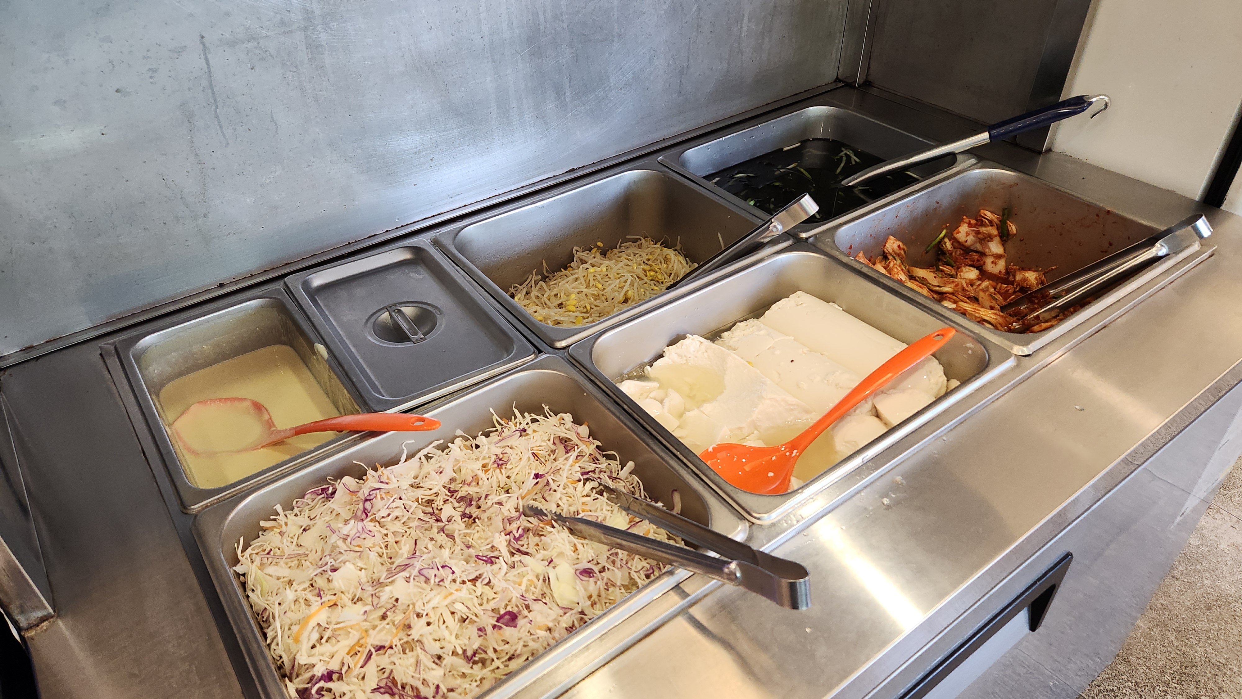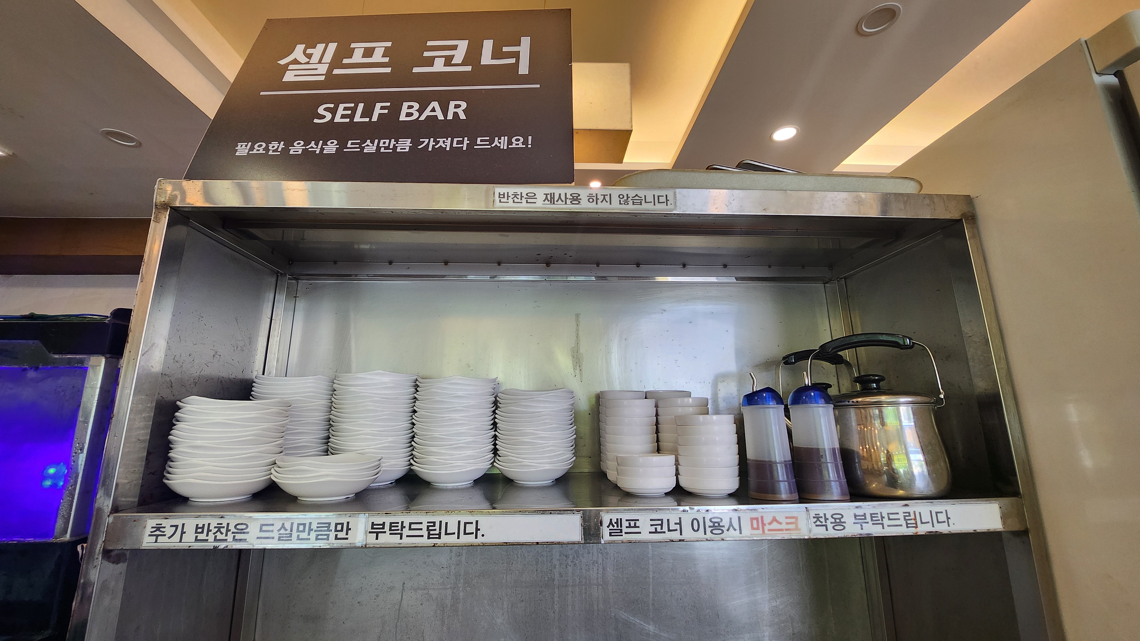 기본찬으로는 연두부, 오이냉국, 김치, 야채샐러드 등이 나옵니다. 드시고 모자라시면 셀프바를 이용하시면 됩니다!