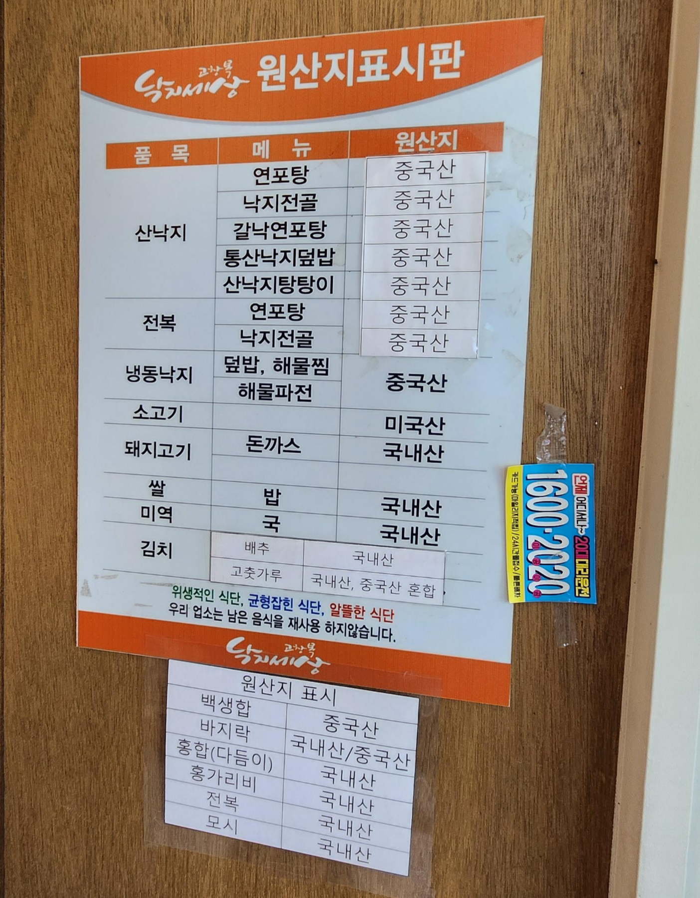 메뉴별 원산지는 아래 표를 참고하시면 됩니다. 물가 때문인지 대부분 중국산이네요.