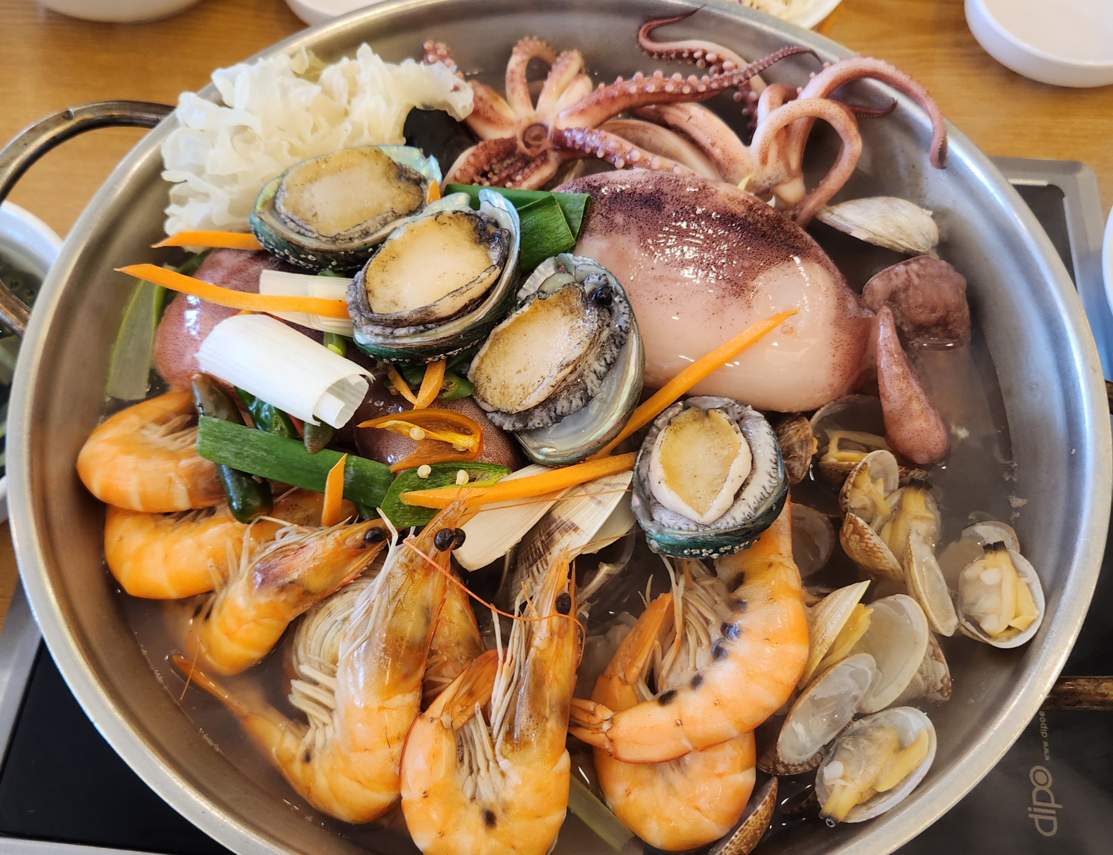 해물칼국수 4인(총 60,000원)입니다. 오징어, 전복, 새우, 바지락 등 정말 다양한 해산물들이 들어가 있고, 생칼국수면도 줘서 먼저 해물을 즐긴 다음에 나중에 칼국수를 해 먹으면 됩니다.