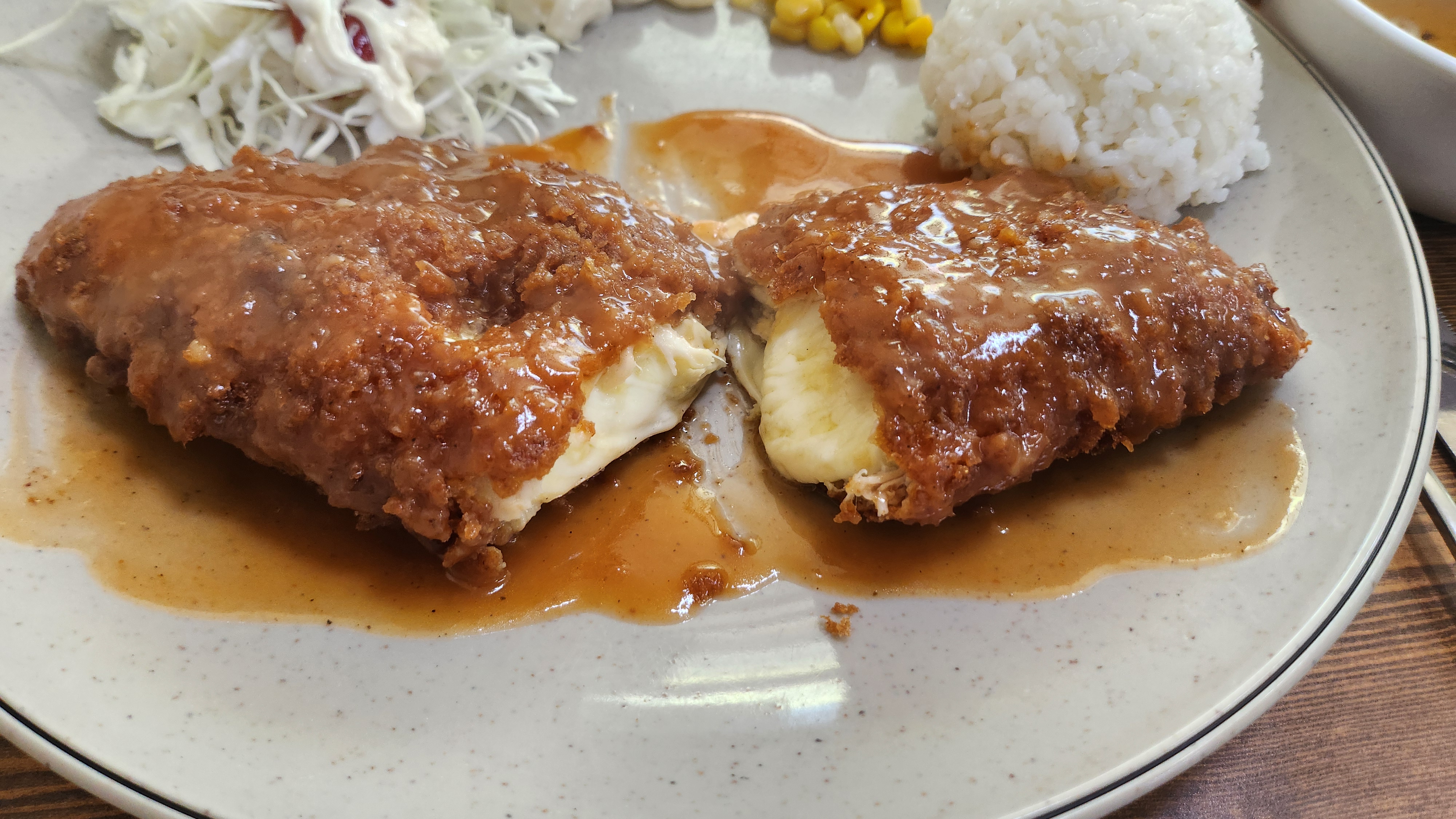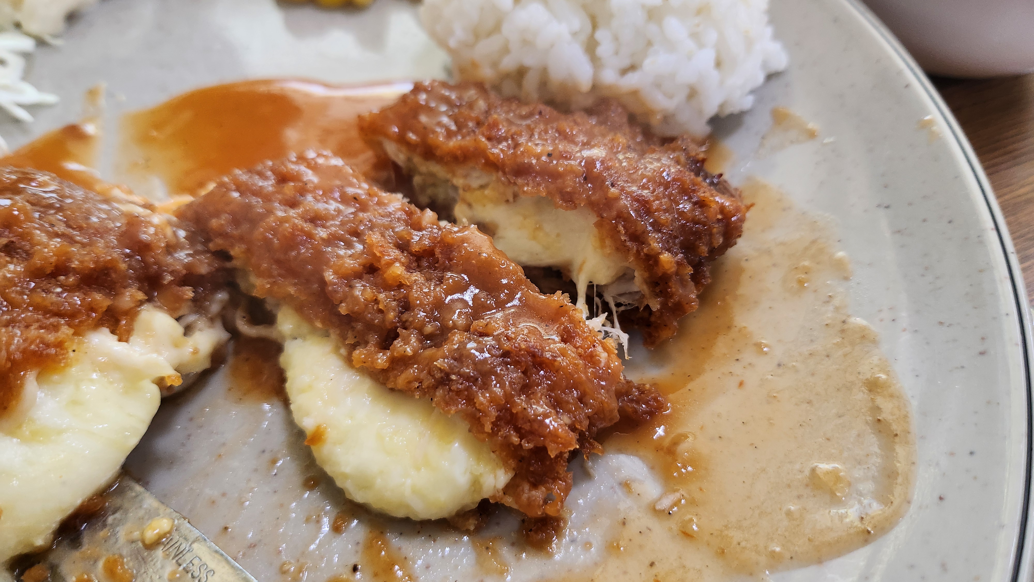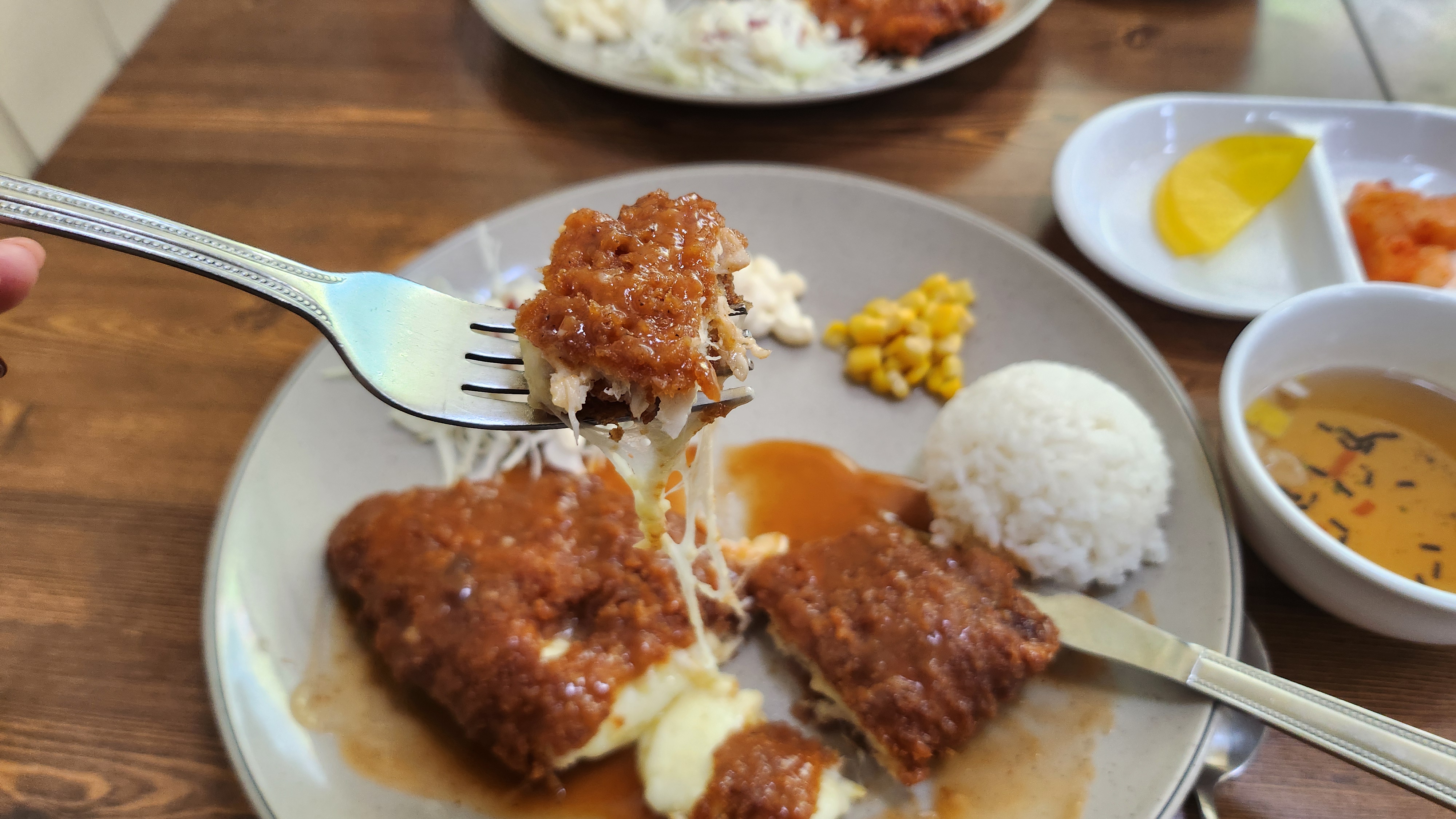 다음은 치즈돈까스 입니다. 처음 인상은 투박하고 크진 않아서 다 먹어도 배부를까 싶었는데, 안에 치즈가 가득했고 배불리 먹을 수 있었네요. 치즈도 잘 늘어나고 맛도 좋아서 잘 먹었던 것 같습니다.