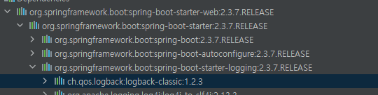 - slf4j의 구현체로써 동작하는 logback은 Springboot 환경의 경우는 spring-boot-starter-web안에 spring-boot-starter-logging의 logback이 기본적으로 포함되어 있어서 별다른 dependency 추가 없이 사용할 수 있다.