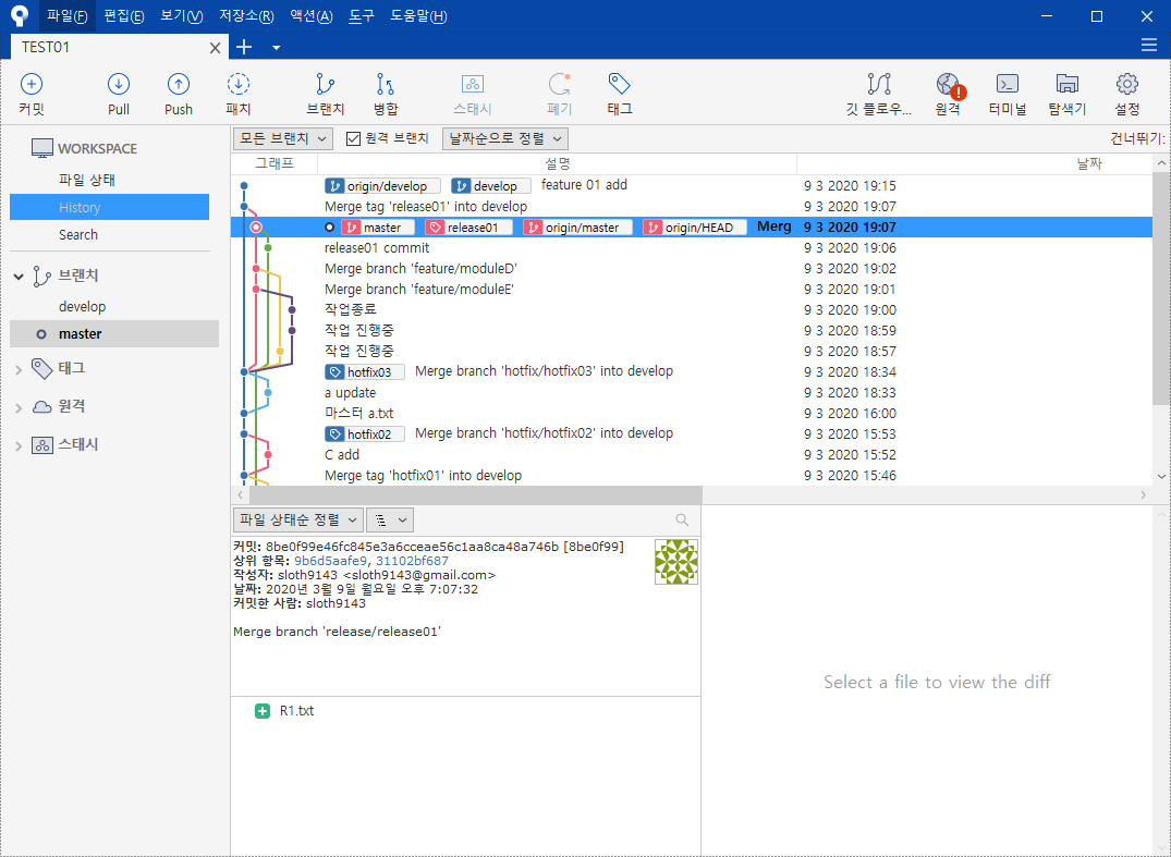 - 배포 가능한 상태만을 관리, 커밋할 때에는 태그를 사용하여 배포 번호를 기록