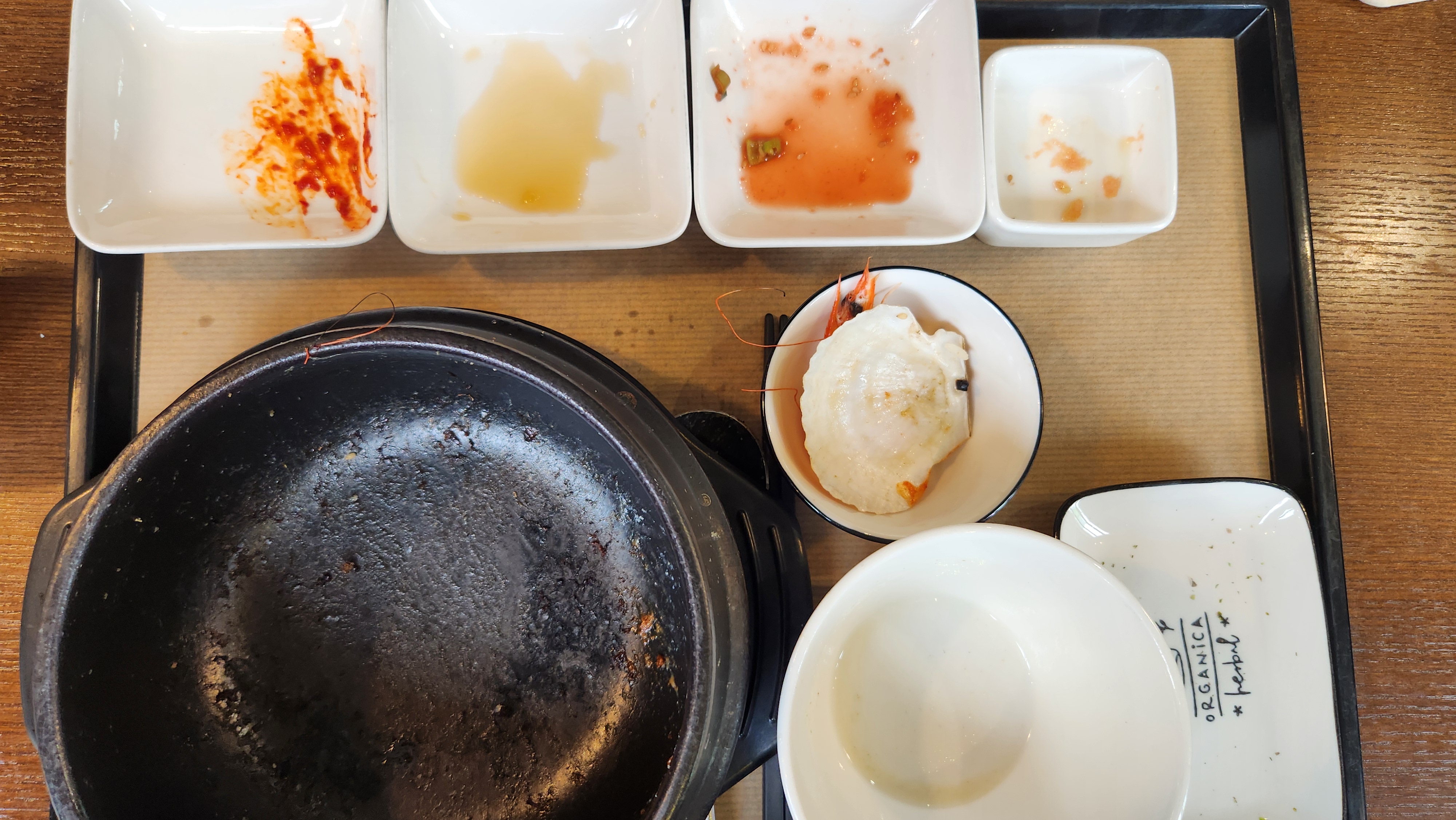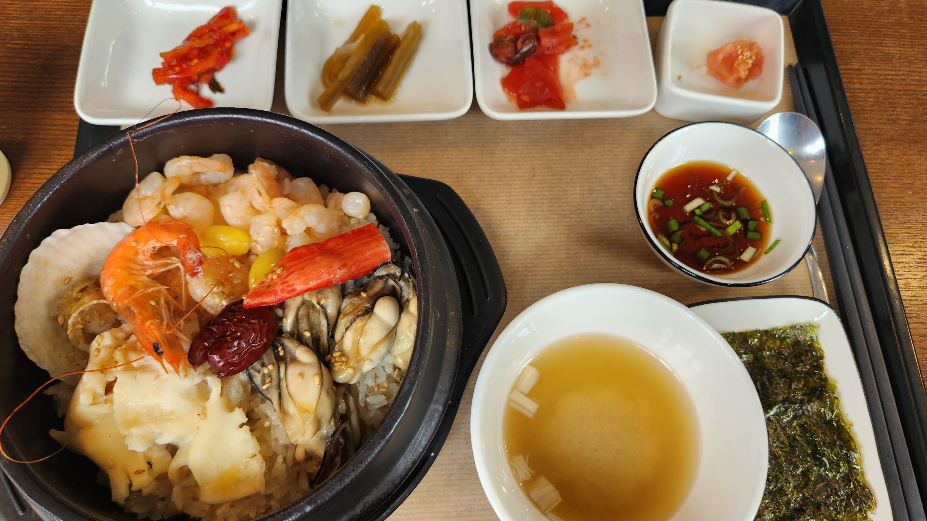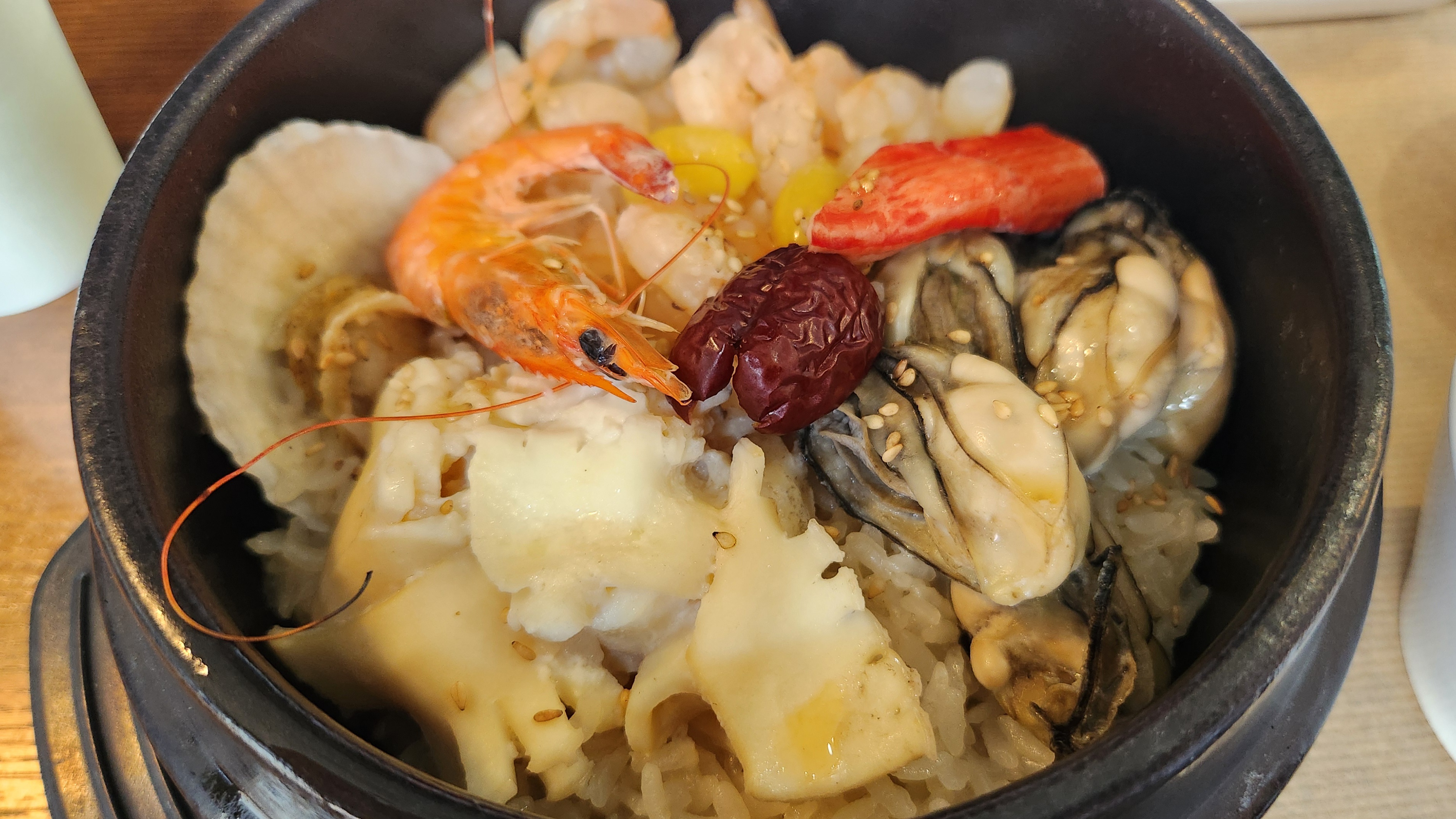 제가 먹었던 해물솥밥은 굴, 새우, 알새우, 가리비, 오징어 등 다양한 해물이 들어가 있어서 좋았지만, 오징어도 덩어리 채로 조리되어 있었던 점이나 솥밥 누룽지도 과하게 눌어 살짝 탄 것 같아서 전반적인 완성도가 아쉽게 느껴졌습니다.